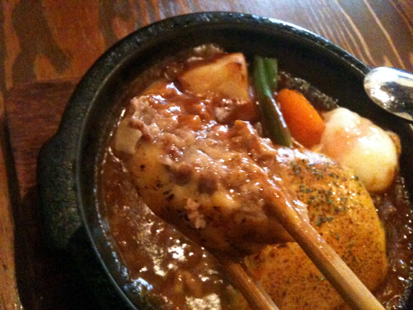 ハンバーグが残り半分になったところで温泉卵をつぶして絡める!