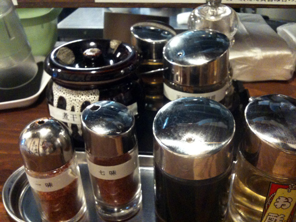 一味、七味、ブラックペッパー、お酢、煮干しふりかけ、醤油(卵かけご飯用)、スープ割(つけ麺用)